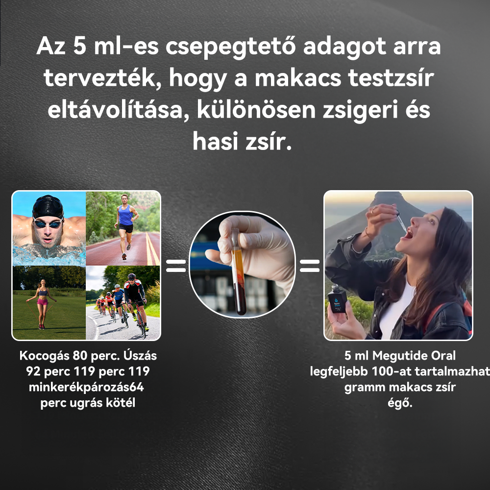 Tanulmányok kimutatták, hogy 5 ml Megglutide belsőleges oldat akár 100 gramm makacs zsírt is elégethet. És sok időbe telik 50 gramm zsír elégetése edzéssel (80 perc kocogás, 92 perc úszás, 119 perc kerékpározás, 64 perc ugrókötél). Egy cseppentő adagja 5 ml, és kifejezetten a makacs zsírok elégetésére és a szervezetből való eltávolítására szolgál, különösen hatékonyan csökkenti a zsigeri és hasi zsírt.