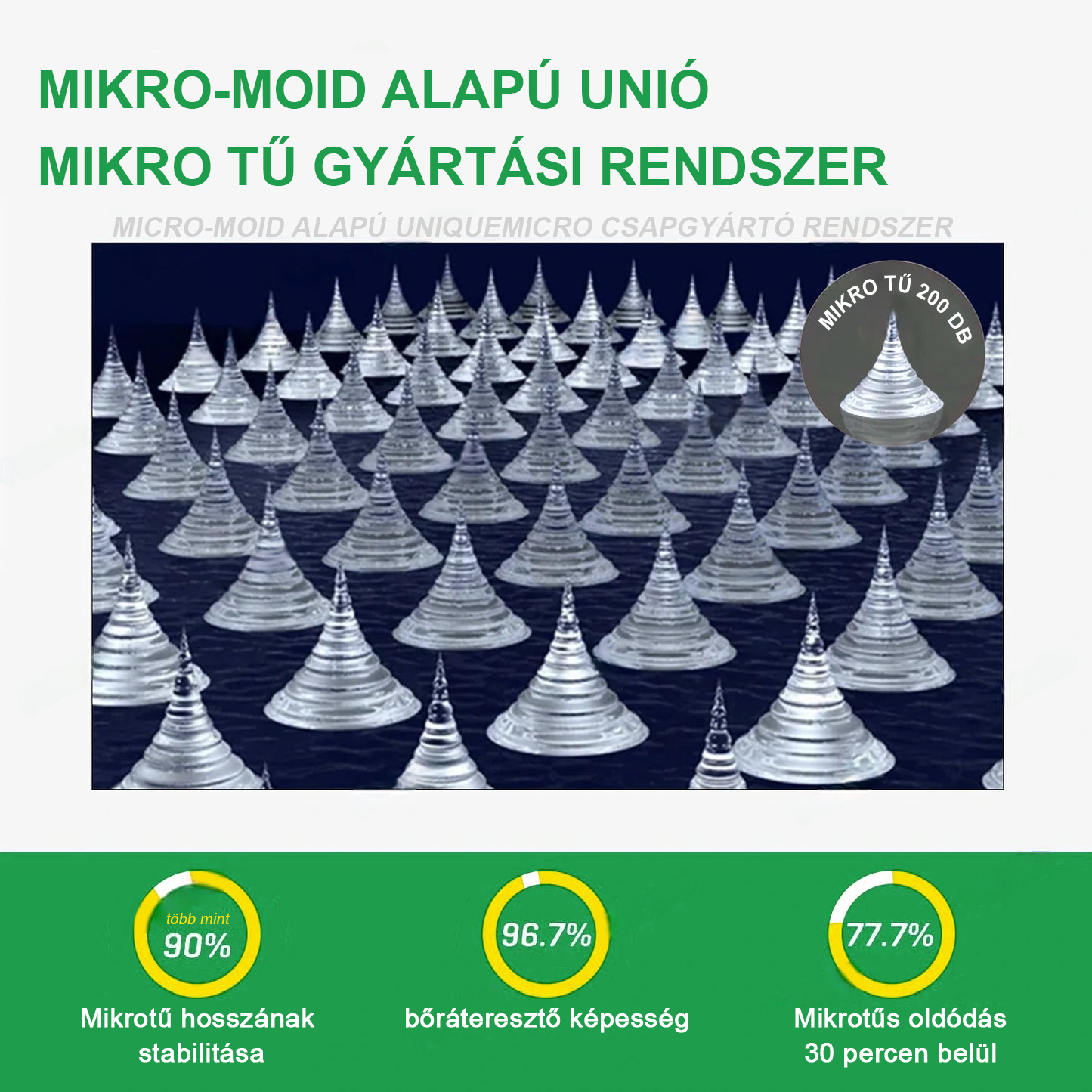 Mindegyik tű 0,27 mm hosszú, a hajszál vastagságának mindössze 1/7-e, és oldható gyógyszerből készült. Ezeket a mikrotűket precíziós tervezéssel, a legmodernebb gyártási technikákkal tervezték, hogy zökkenőmentes, fájdalommentes élményt biztosítsanak, miközben hatékonyan juttatják el a hatóanyagokat közvetlenül a bőrbe.