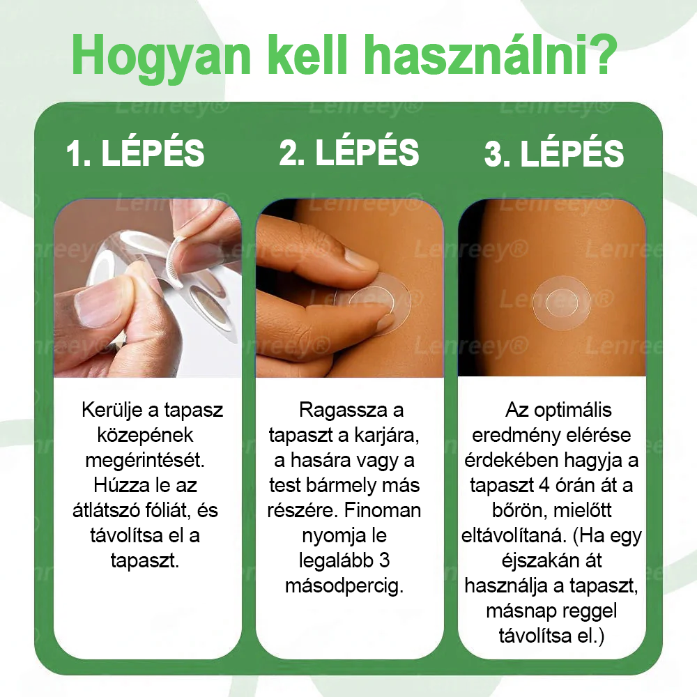 Kérjük, győződjön meg róla, hogy az alkalmazás helyén a bőrt megtisztította használat előtt, és kerülje, hogy sebekre, ekcémára vagy más bőrproblémákra alkalmazza. Ha bármilyen kellemetlen érzést tapasztal a használat során, azonnal hagyja abba a kezelést, és forduljon orvoshoz.