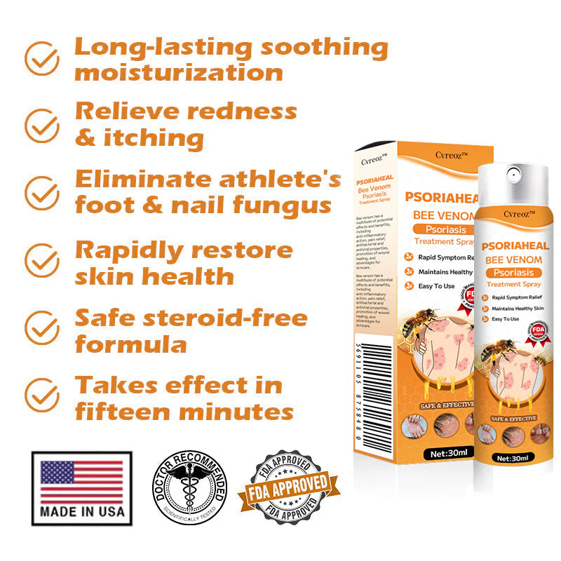 Cvreozâą PsoriaHeal Bee Venom Psoriasis Treatment Spray cleanses the skin from the inside out, alleviating itching and inflammation. It is free from irritating chemicals and does not exacerbate already damaged skin. Cvreozâą helps minimize the growth of skin cells triggered by psoriasis, providing relief from inflammation, itching, and scaling associated with this condition.