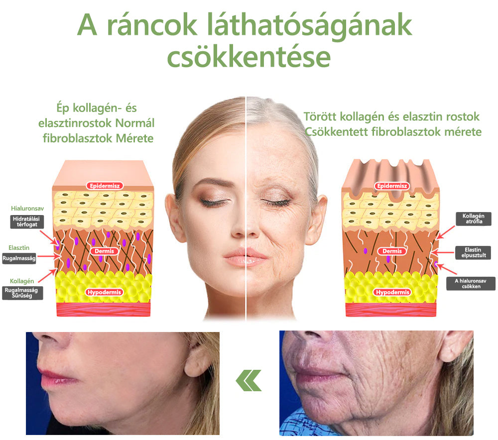 Kollagén: A kollagén a bőr fő szerkezeti fehérje, amely rugalmasságának és feszességének megőrzéséért felelős. Az életkor előrehaladtával a szervezet kollagéntermelése csökken, ami a bőr megereszkedéséhez és ráncokhoz vezet. A kollagén pótlása segíthet visszaállítani a bőr simaságát és rugalmasságát.