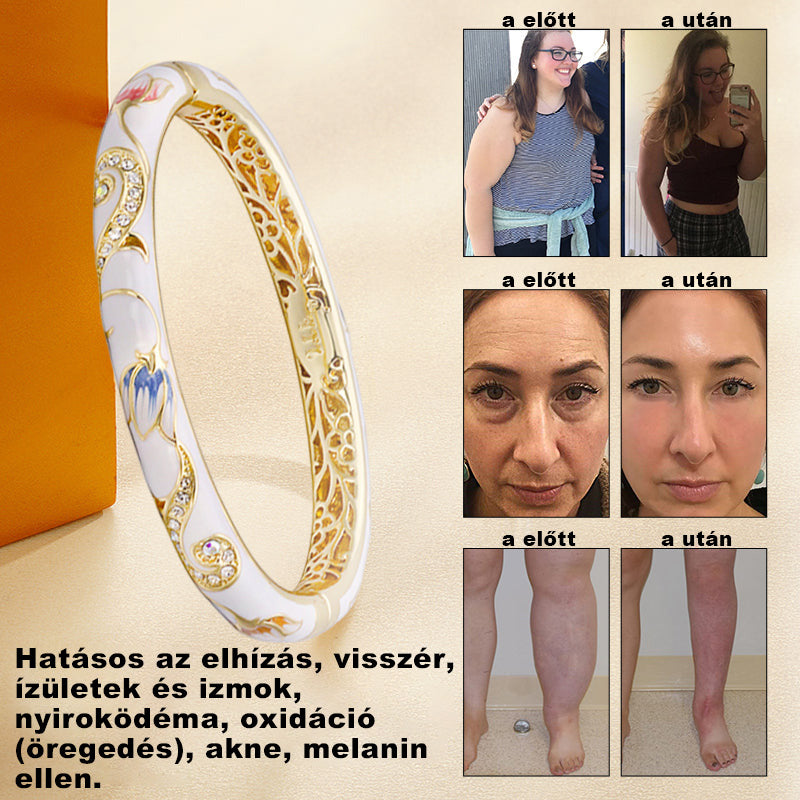 „Nincs itt Photoshop – ez az igazi változás az arcomon! Előző munkahelyemen gyakran dolgoztam hosszú órákat, ami kibillentette a melanintermelésemet, és hormonális problémák miatt ráncos lett a bőröm. Azt hittem, a munkahelyváltás segít, de nem vettem észre semmi javulást. Aztán a férjem adta nekem ezt a gyönyörű karkötőt, amit azonnal megszerettem! Először nem tudtam, hogy néhány hét után ránctalanító és bőrvilágosító tulajdonságokkal rendelkezik. Csak amikor a férjem észrevette a pozitív változásokat a bőrömön, akkor mondta el, hogy mennyire hatékony. Ekkor jöttem rá, hogy nem csak a szépsége miatt vette meg, hanem a hihetetlen előnyei miatt is!”