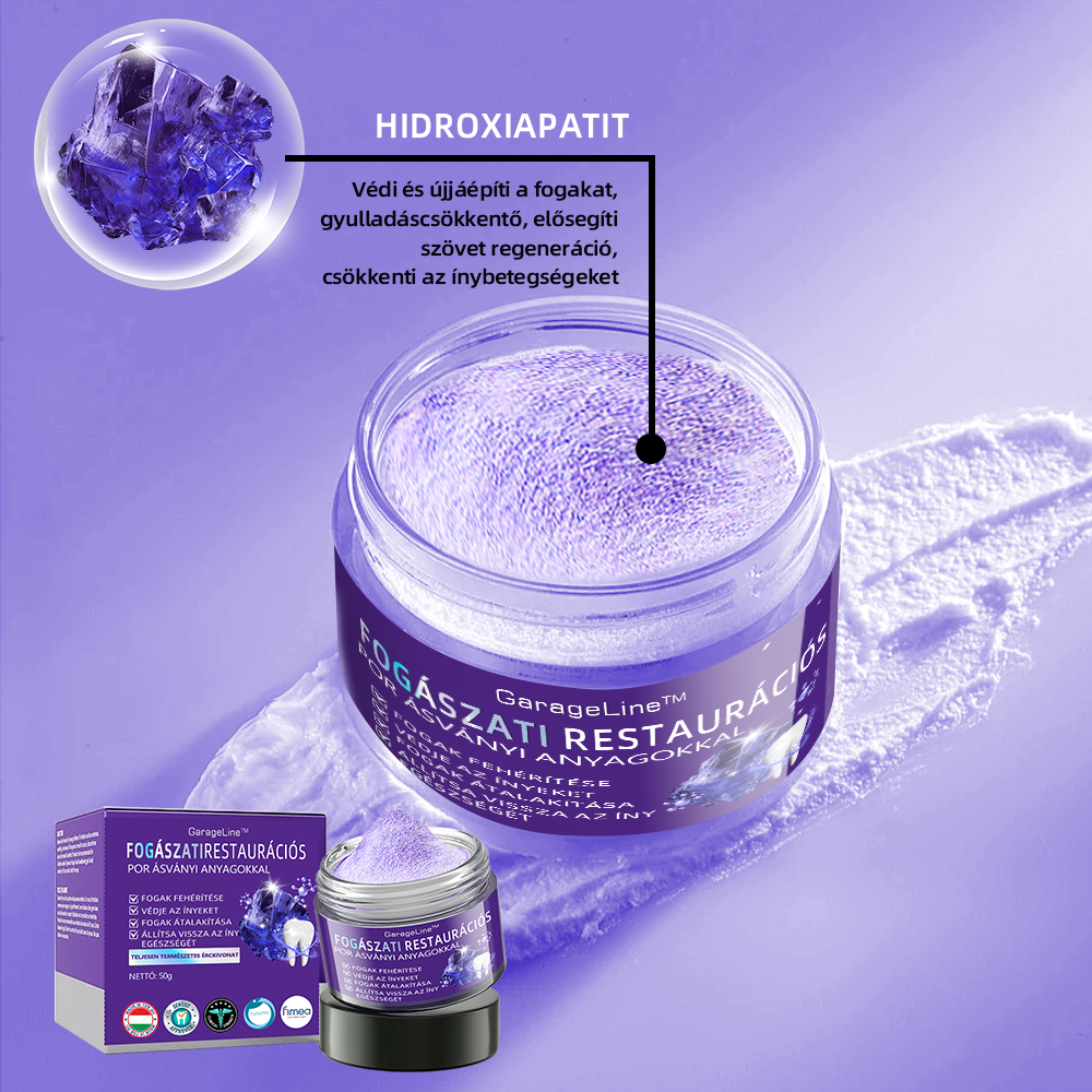 A GarageLine™ Fogrestauráló ásványi por eltávolítja a baktériumok 99,99%-át, megszünteti a rossz leheletet, eltávolítja a lepedéket és a fogkövet, kezeli az ínygyulladást és a parodontitist, enyhíti a fogfájást, megelőzi és kezeli a fogszuvasodást, helyreállítja a fogzománcot, serkenti a helyreállító dentin regenerációját és támogatja az elveszett fogakat.